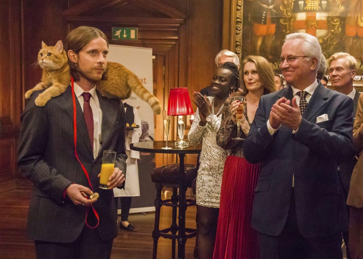 James (Luke Treadaway) und Bob beim Empfang seines Verlags bei dem sein neues Buch angekündigt wird