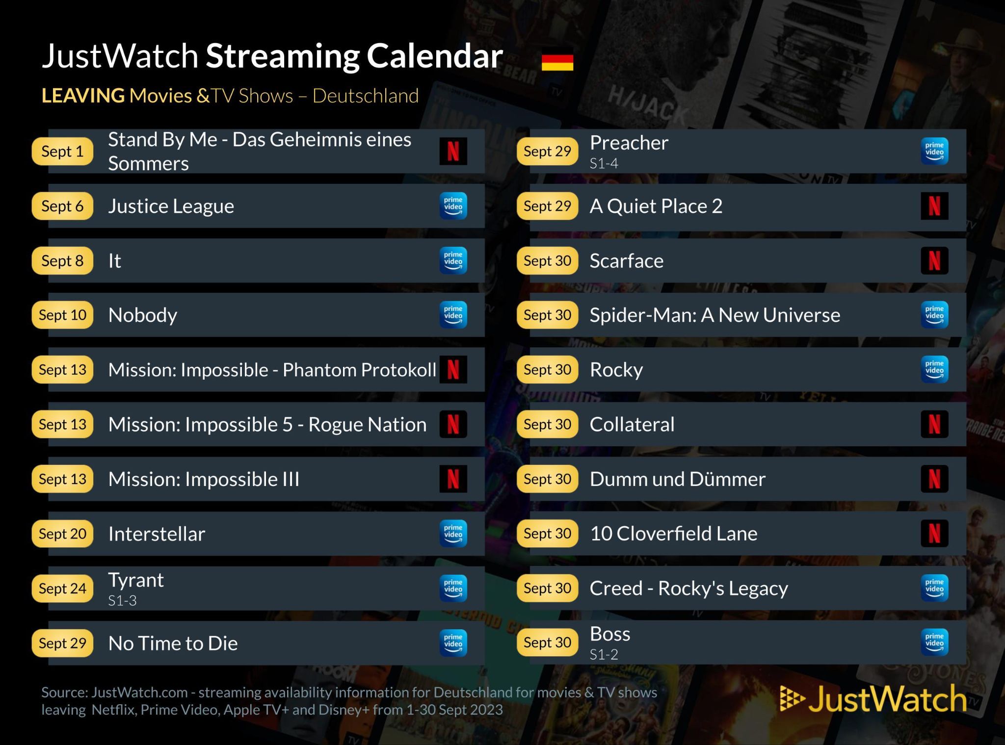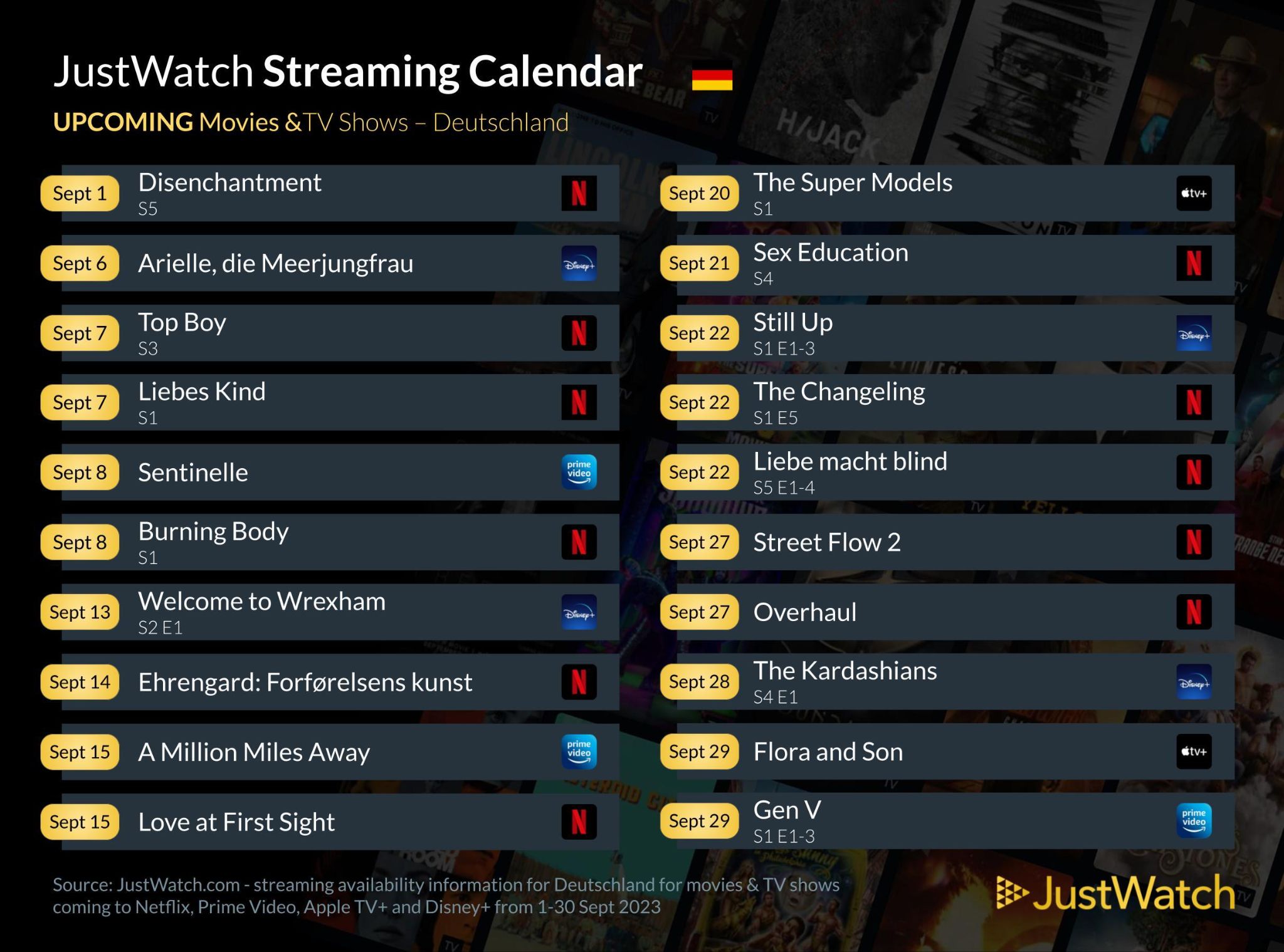 Der Streaming-Guide für Filme, Serien & Sport „JUST WATCH“ bietet euch die Gelegenheit, um herauszufinden, wo man neue, beliebte und kommende Entertainment-Angebote streamen kann. Dazu haben wir heute eine aktuelle Übersicht aller kommenden Neuerscheinungen und Abgänge der bekannten Streaming-Anbieter.